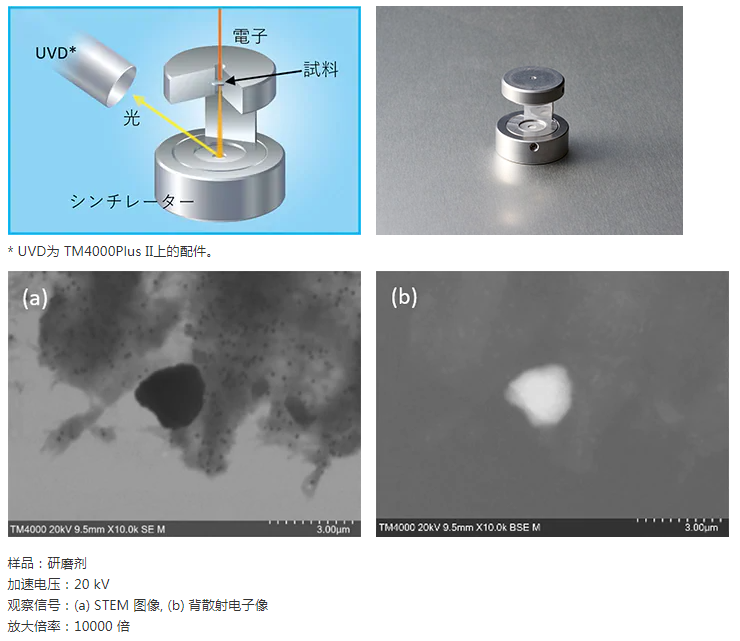 采用高感度低真空二次电子检测器(UVD)。通过检测由于电子线与残留气体分子之间的碰撞而产生的光,可以观察带有二次电子信息的图像。此外,通过控制该检测器,来检测电子照射所产生的光,可以获得CL信息(UVD-CL:带有CL信息的图像)。